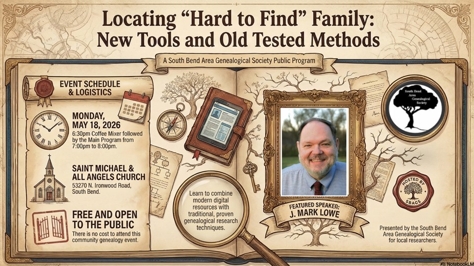 The South Bend Area Genealogical Society was established in 1976, to promote the collection, preservation and dissemination of knowledge and information with reference to genealogical and related historical data, and to instruct in research and documentation of said data.